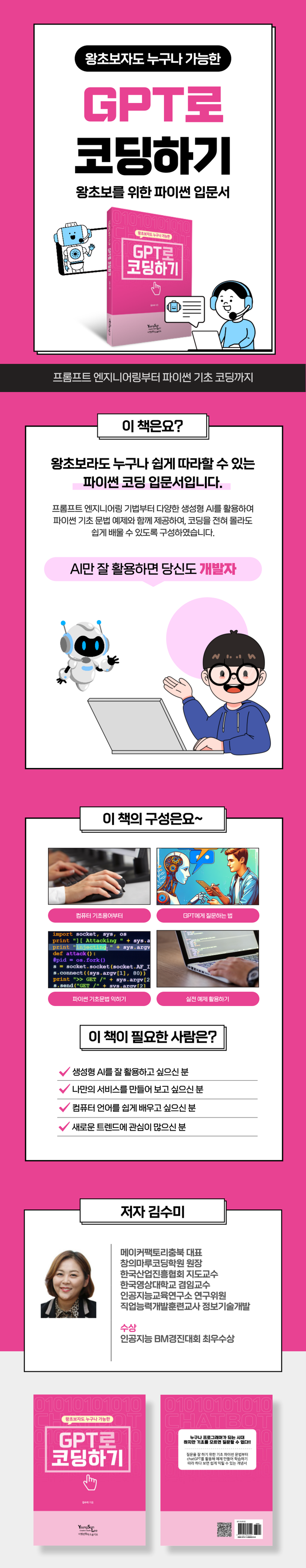 본 책은 왕초보라도 누구나 쉽게 따라할 수 있는 파이썬 코딩 입문서입니다. GPT에게 질문하는 법(프롬프트 엔지니어링)부터 파이썬 기초 코딩까지 한 권으로 완성되어 있습니다.