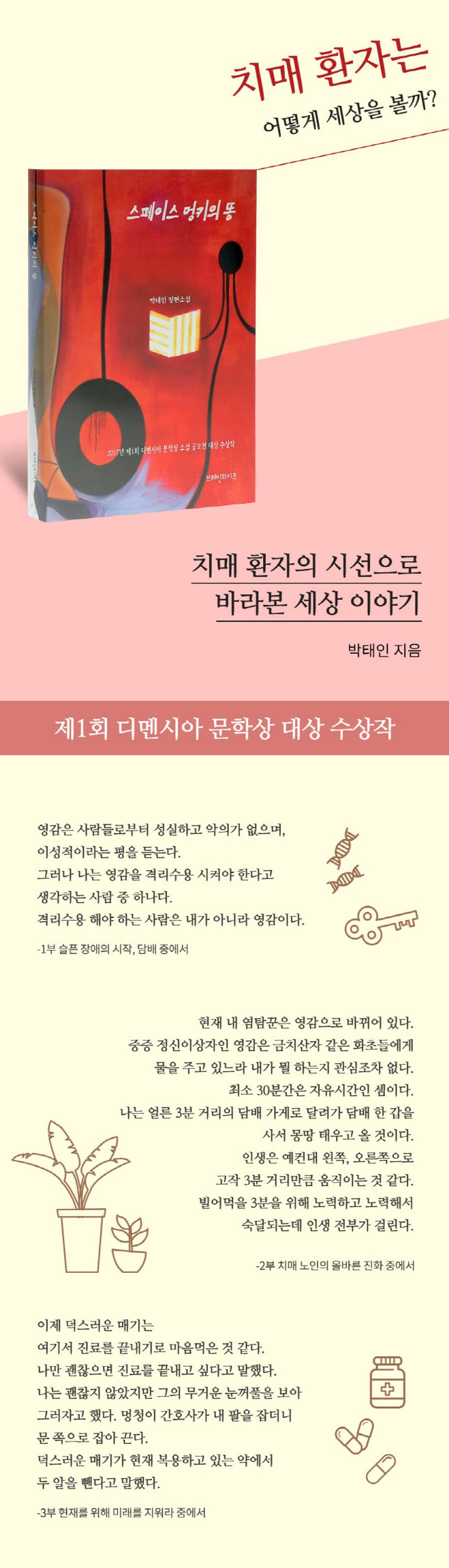 【디멘시아뉴스】에서 시행한 [제1회 디멘시아 문학상 소설 공모전]에서 대상을 수상한 박태인 작가의 『스페이스 멍키의 똥』은 장편소설이라는 형식이 가지고 있는 긴 호흡을 유지하면서 작품의 주제 의식이 명확하게 드러나는 등 소설 창작의 기본에 충실한 작품이다.