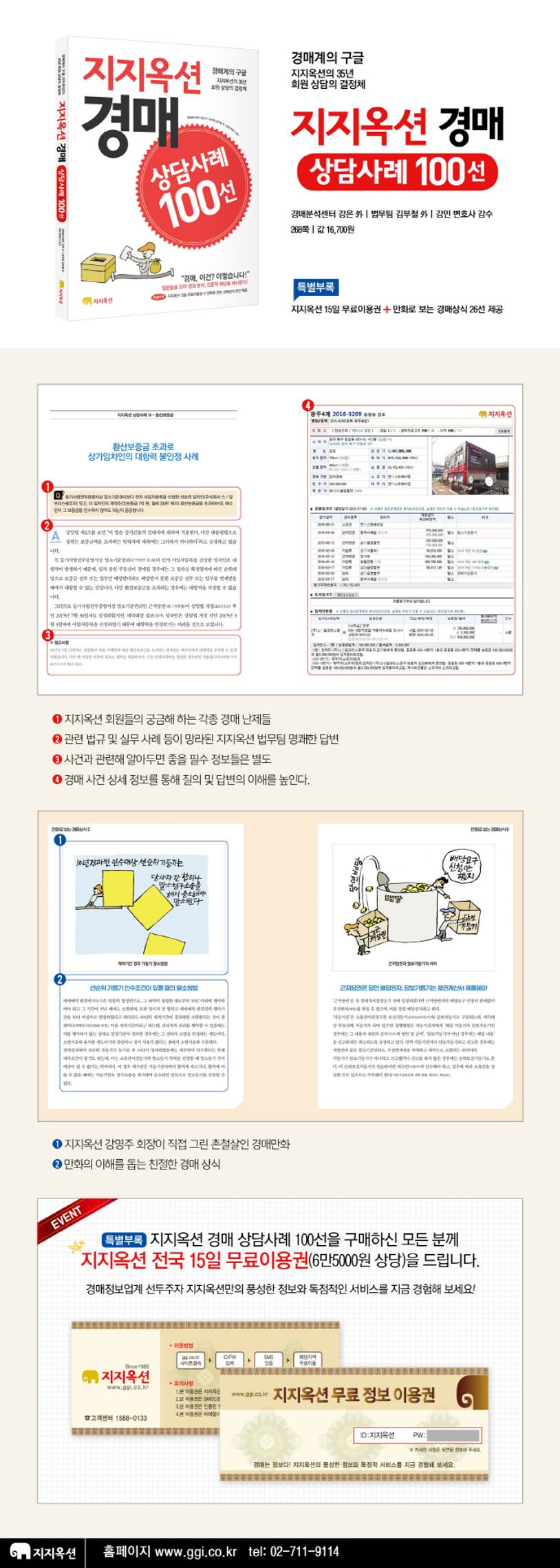 『지지옥션 경매 상담사례 100선』은 지지옥션 법무팀이 지난 1년간 회원들에게 질의 받고 답변한 상담사례 2만여 건의 사례 중, 경매 실무에서 한 번 쯤은 짚어봐야 하는 중요 사례 100가지를 집대성해서 엮은 것이다. 책 구성은 이해가 쉽도록 질문과 답변에 따른 각 실제 경매사건을 나란히 실어 실전 경매에 적용할 수 있도록 했다. 이외에 강명주 지지옥션 회장이 직접 그린 경매 상식 만화 와 해설 27건도 수록되어 있다.