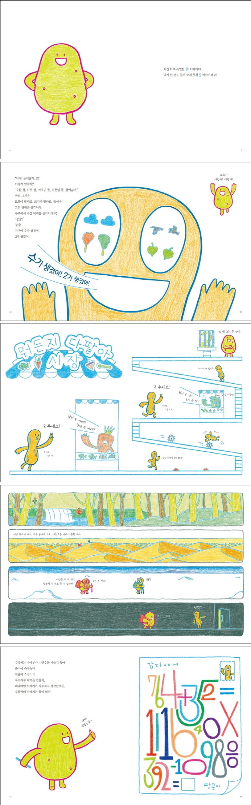 『2 주세요!』는 만만한수학 시리즈 두 번째 책이다. 첫 번째 책 《점이 뭐야?》가 유클리드 기하학을 통해 돼지들과 함께 즐기는 신비한 수학적 상상 놀이였다면, 이 책은 가장 추상적인 수론의 세계를 경험해 볼 수 있게 해 준다. 이 책의 첫 장을 펼치면 귀엽고 동글동글하고 당돌한 감자가 튀어나와 소리친다. “이건 아주 특별한 둘 이야기야! 네가 한 번도 들어 보지 못한 2 이야기라고!” 감자와 땅콩을 따라 한 번도 가 보지 못한 수학의 세계로 들어가 보자!