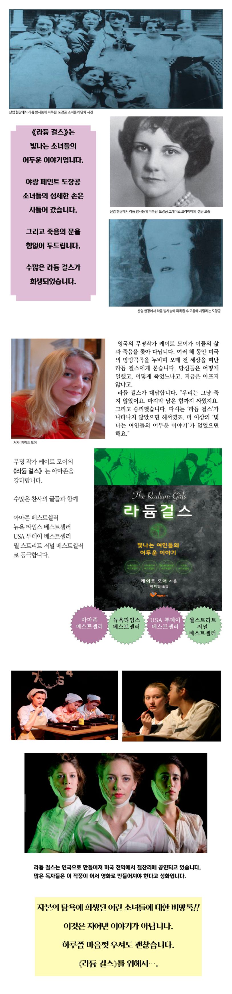 작가 케이트 모어는 타고난 이야기꾼이다. 《라듐 걸스》는 뉴욕타임스와 아마존 베스트셀러로 등극했고, 지금도 수많은 찬사의 글들이 연일 쏟아지고 있다. 독자들은 이 책을 통해 라듐에 대한 과학적 지식과 더불어 논픽션 장르에서 기대하기 어려운 독서의 즐거움도 맛볼 것이다. 라듐 중독이 실체를 드러내 가는 과정은 마치 의학 미스터리처럼 흥미롭고, 지난한 법정투쟁 과정은 그 어느 법정 드라마 못지않은 재미를 더한다. 케이트 모어의 스토리텔링에는 청춘이 있고 사랑이 있고 감동과 애절함이 있다. 무엇보다도 정의에 대한 열망이 녹아 있다.