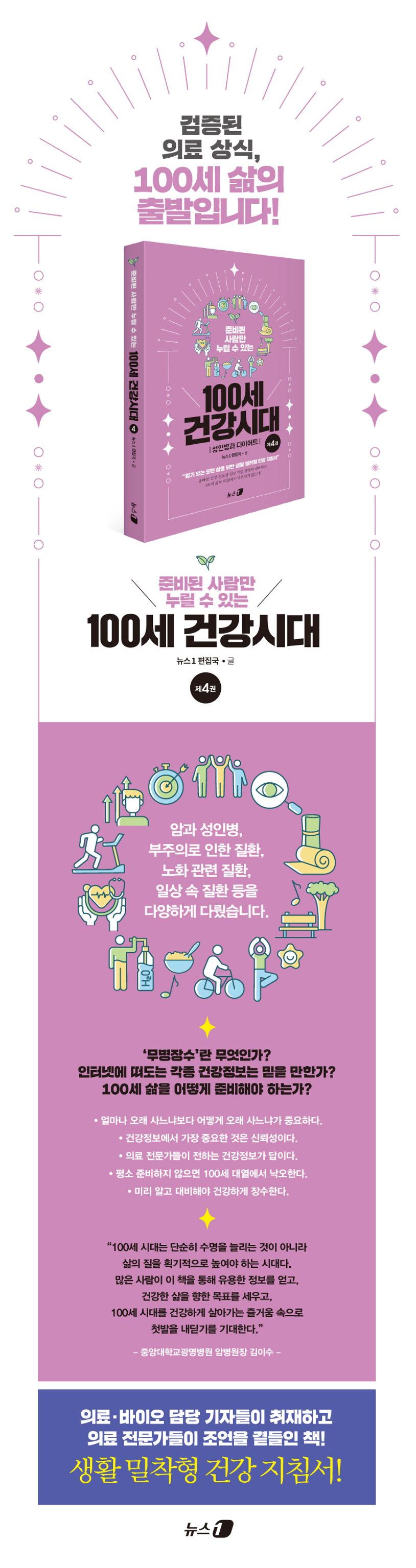 이 책의 내용들은 뉴스1이 2021년부터 연재하고 있는 ‘100세 건강’ 코너의 기사들을 집대성하고 재구성한 것이다. ‘100세 건강’ 코너는 올바른 의학 정보에 기초해 생명과 직결되는 고급 건강 정보를 접할 수 있는 공간이다. 평소 이 기사들을 즐겨보는 편인데, 우리가 주변에서 접하는 다양한 질병들을 다루고 있어 실생활에 유익하고 도움이 된다.