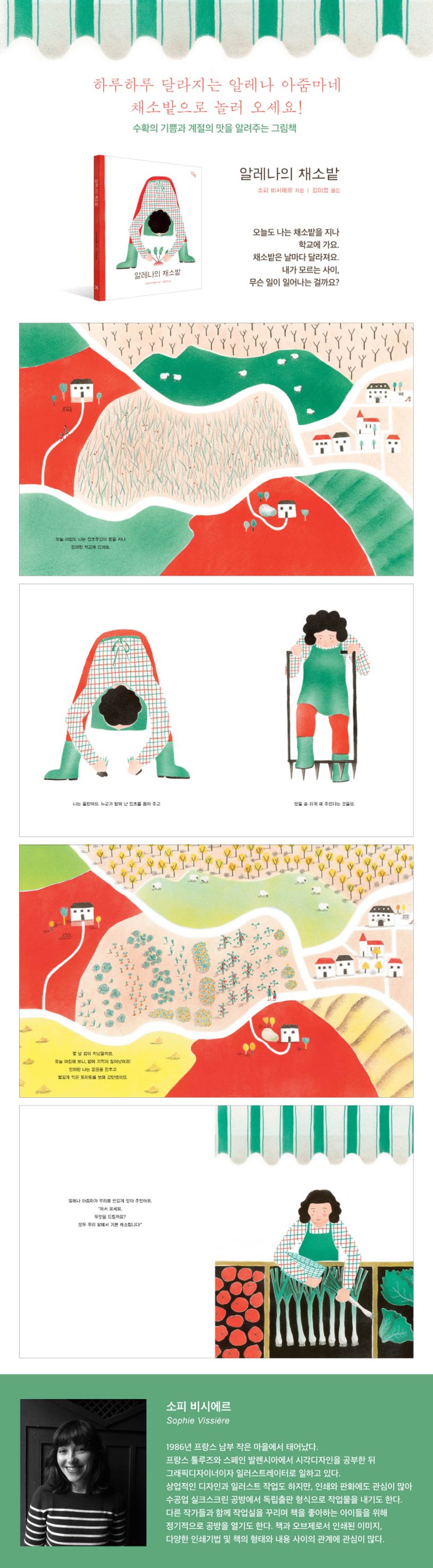 학교 가는 길은 언제나 호기심으로 가득합니다. 황무지 같던 밭이 근사한 채소밭으로 변하고 있거든요. 어, 오늘은 이게 바뀌었네? 내가 없는 동안 밭에서 무슨 일이 벌어지는 거지? 누가 땅을 갈고 채소를 가꾸는 걸까? 아이는 궁금합니다. 한편, 아이가 학교에 간 그 시간, 알레나 아줌마는 밭을 가꾸고 있습니다. 돌멩이를 골라내고, 잡초를 뽑고, 땅을 일구고, 이랑을 세웁니다. 반복되는 일상, 반복되는 풍경 속에서 소소한 변화를 찾아내는 아이의 호기심어린 시선과 묵묵히 밭을 일구는 알레나 아줌마의 일하는 모습이 서로 아름답게 교차됩니다. 소피 비시에르가 쓰고 그린 첫 번째 그림책으로, 절제된 색을 써서 단순하면서도 아름다운 그림을 그린 것이 돋보입니다. 아이에게는 농부의 존재와 자연의 변화, 수확의 기쁨을 알려 주고, 바쁜 일상에 쫓기는 어른들에게는 휴식과 위로를 선물합니다.