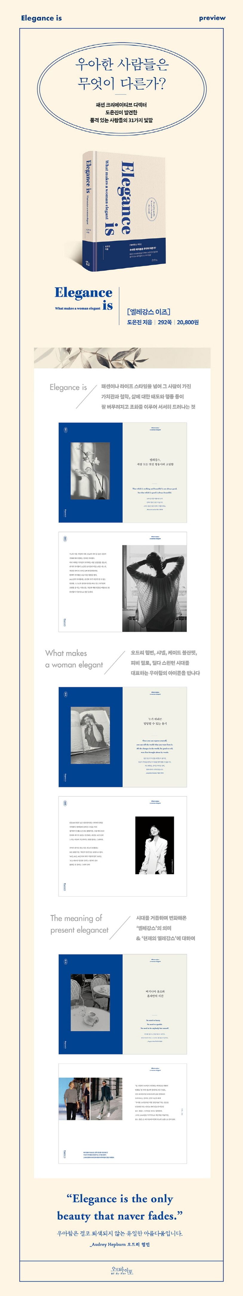 나이를 불문하고, ‘우아하다’라는 말은 최고의 칭찬일 수밖에 없다. 겉으로 드러나는 매력을 넘어, 그 사람에게 풍기는 고유한 분위기, 내면의 아름다움까지 내포한 표현이기 때문이다. 그렇다면 많은 사람들이 그토록 선망하는 이미지 ‘엘레강스Elegance’란 과연 무엇일까? 또 그것은 어떻게 만들어지는 것일까? 이 책은 패션 크리에이티브 디렉터 도은진 저자의 이러한 질문으로 탄생 되었다.
