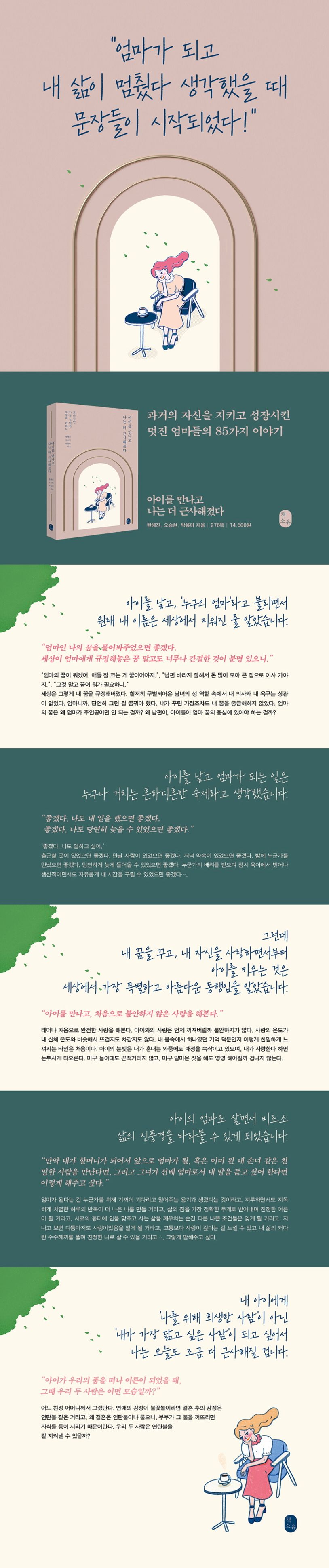 아이를 키우며 자신의 삶과 꿈도 키워나가겠다고 다짐하면서 임신, 출산, 육아를 통해서 얻은 경험과 사유들을 풀어낸 책 속의 제목 문장들을 모아둔 차례를 읽다 보면 마치 엄마들을 위한 긴 시 한 편을 감상한 기분을 느낄 수 있다. 그날따라 마음의 문을 더 두드리는 문장이 있다면 그것이 이끄는 글을 읽으며 위로 받고, ‘다른 엄마들 다 하는 것, 나만 엄살일까 봐, 유난일까 봐.’라는 자기검열 속에서 줄곧 묻어두었던 진심들을 살펴보며 자기 성장을 일궈낼 수 있는 힘을 얻을 수 있을 것이다.