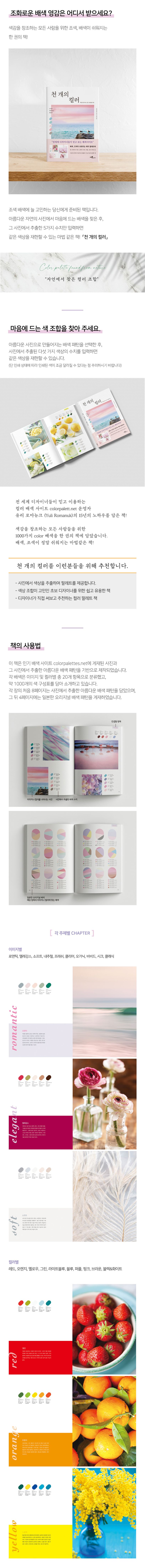 「천 개의 컬러」는 (colorpalettes.net)에서 소개된 사진과 색 구성표를 바탕으로 이미지 및 컬러별로 분류해 20개 항목으로 재구성했습니다. 사진에서 추출한 1,000개의 배색 패턴은 〈Color Palettes〉의 운영자이면서 디자이너 & 사진작가로 활동하는 유리 로마뉴크가 제작했고, 오리지널 배색 패턴은 수많은 배색 본 경험과 제작 실적이 있는 이 책의 디자이너 시바타 사오리가 담담했다.