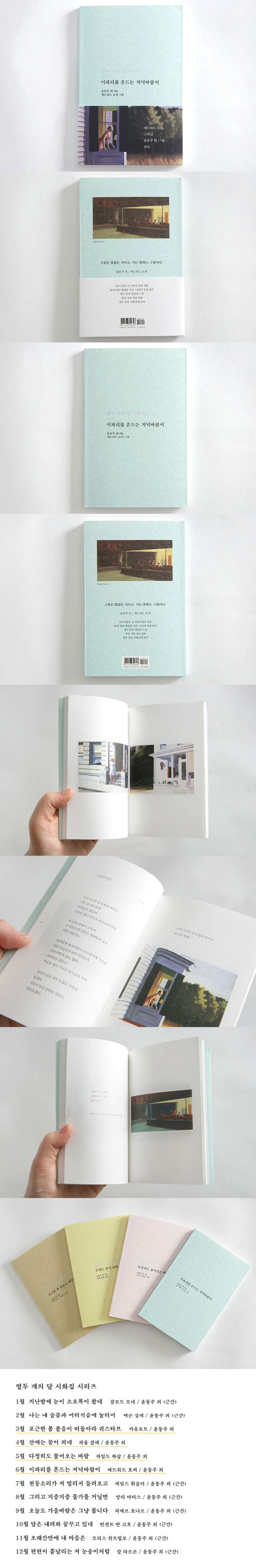 『이파리를 흔드는 저녁바람이』는 ‘열두 개의 달 시화집’ 시리즈 중 6월편으로, 초여름에 어울리는 에드워드 호퍼의 그림과 윤동주, 백석, 김영랑, 정지용, 한용운 등 18명의 시인들의 초판본 시를 엮은 책이다. 한때 우리가 교과서에서 만났던 시인들의 시를, 다시 찬찬히 읽고 행간을 음미하다보면, 정신없는 일상에서 잠깐 여유를 찾을 수 있을 것이다. 재미도 감동도 관념도 없이 살았던 삶을 살고 있던 당신에게, 잠깐이나마 감미한 저녁바람을 느낄 수 있는 시간을 만들어줄 시화집이다.