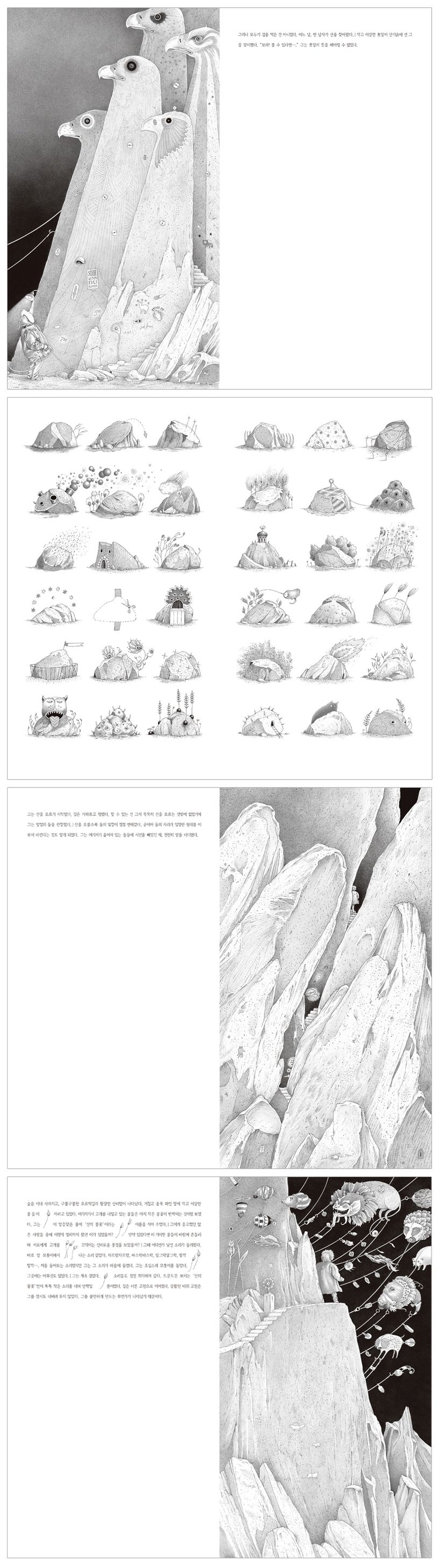사람들이 경고한 대로 산을 오르는 것은 쉽지 않았습니다. 남자는 자주 길을 잃고 헤맵니다. 금방이라도 살아 움직일 것 같은 무서운 바위 조각들이 나타나기도 하고, 길이 자꾸만 사라져버려 곤혹스러워하기도 합니다. 칠흑 같은 어둠 속에서 두려움에 떨기도 하지요. 그렇지만 산이 험난하기만 한 것은 아니었습니다. 어디서 나타났는지 모를 기이한 불빛이 남자의 앞길을 밝혀 주기도 하고, 더는 나아갈 수 없을 것 같은 깊은 절망에 빠져 주저앉아 있을 때 작은 딱정벌레가 나타나 남자를 도와주기도 합니다. 주위의 돌들은 시시각각 그 빛깔이 변하고, 처음 들어보는 신기한 소리도 들려옵니다. 불꽃처럼 생긴 작은 풀들이 바람에 흔들리며 서로에게 고개를 끄덕이는 아름다운 풍경을 보았을 때 남자는 벅차오르는 감동을 느끼기도 합니다.