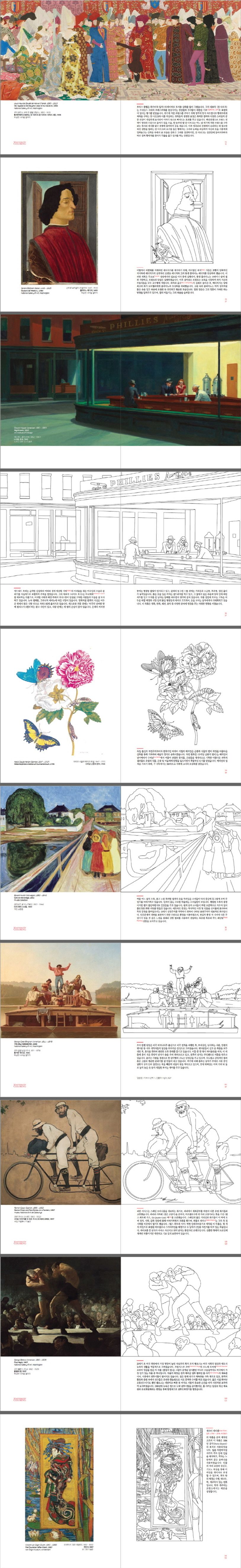익숙한 유명 작품도 여럿 보이지만, 대부분이 쉽게 볼 수 없었던 작품이라, 흥미와 책 넘기는 재미를 주고 각 작품에 대한 그림 설명은 따로 책을 내어도 충분할 정도로 알차며, 칠하지 않아도 읽을 수 있는 컬러링 북이다.