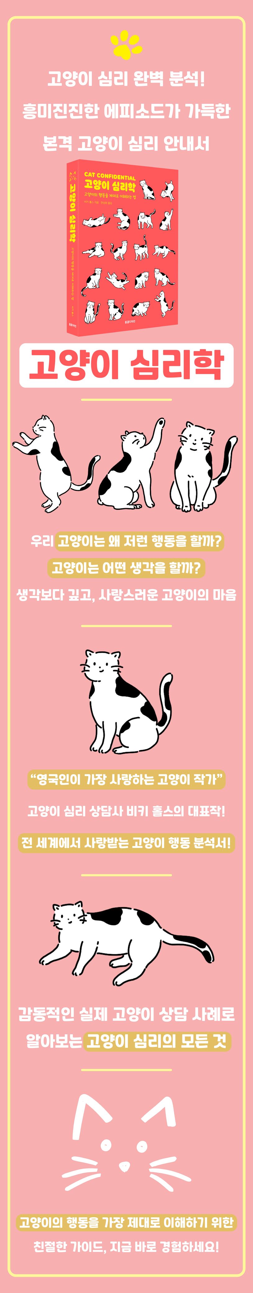 영국 최고의 고양이 심리 분석 전문가, 영국인이 가장 사랑하는 고양이 작가 비키 홀스의 세계적 베스트셀러! 고양이의 머릿속에 든 가장 깊숙한 비밀을 밝혀낸 책! 저자는 영국의 저명한 고양이 심리 상담가로, 수많은 고양이 집사들과 문제 행동을 보이는 고양이들을 도와주고 있다. 그녀는 이 책에서 그동안 직접 경험한 수많은 상담 사례들을 재미있는 이야기로 풀어내며 고양이의 생각과 행동을 깊이 있게 탐구한다. 왜 고양이는 집을 더럽히고, 이웃집 고양이와 싸우고, 사람에게 공격적으로 행동하거나 자신의 털을 뽑을까? 이 책은 이런 질문을 비롯해 훨씬 더 많은 질문에 해답을 제시한다. 여러분은 다양한 고양이 에피소드와 현실적인 조언을 만날 수 있을 것이다. 아주 흥미롭고 마음이 따뜻해지며 가끔 눈물을 자아내기도 하는 이 책은 사람과 고양이의 관계에 숨겨진 독특한 유대감을 보여준다.