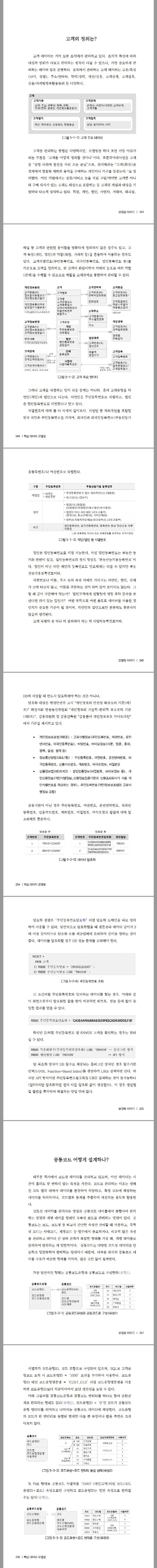 5장은 실제 모델링 사례를 중심으로 고객, 공통코드 등 대부분 시스템에 존재하는 엔티티에 대한 설계 사례나 데이터 모델을 개선한 사례로 구성하였다.