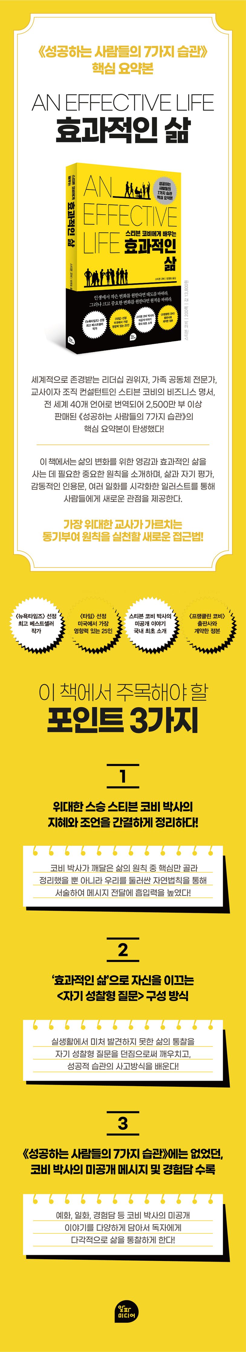 300만 한국 독자의 삶을 변화시킨《성공하는 사람들의 7가지 습관》은 톰 피터스가 ‘당신의 삶을 송두리째 뒤바꿔 놓을 경이로운 책’이라고 소개할 정도로 세상에 커다란 메시지를 전달했으며, 출간한 지 30년이 지난 지금까지도 전미 베스트셀러 최상위를 기록하고 있다. 이 책은 스티븐 코비 박사가 4,000년 이상 통용되어 오던 진리의 원칙을 정리하고 종합한 것으로 수많은 사람에게 영감을 주었다. 성공학 교과서로 널리 읽히는 이 책을 《효과적인 삶》으로 압축하여 다시 한번 세상에 강력한 메시지를 전한다.