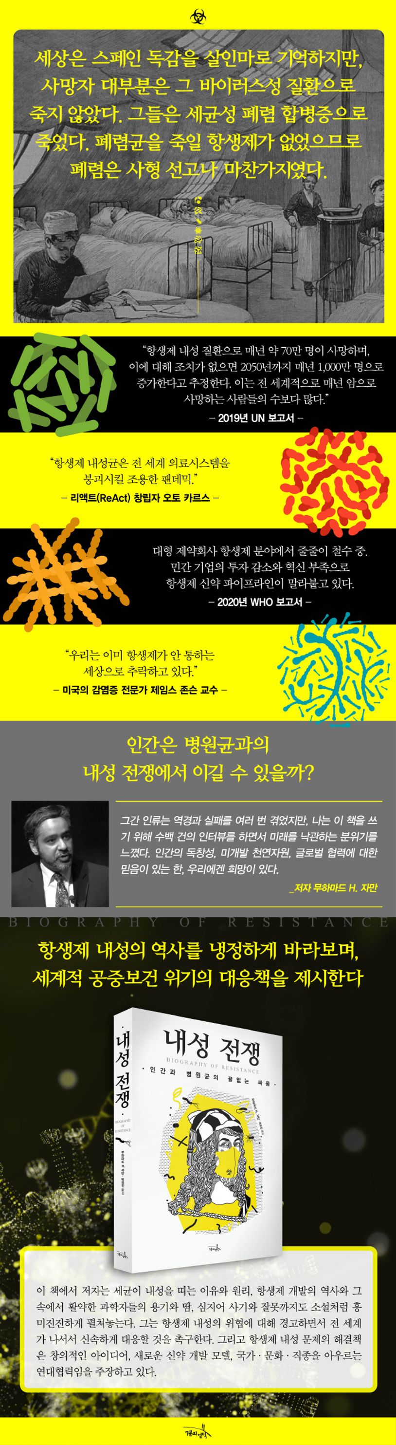 저자 무하마드 H. 자만은 이 책을 집필하기 위해 의과학자, 미생물학자, 유전학자, 과학재단 및 국제기관 종사자 등과 수백 건의 인터뷰를 진행했다. 진솔한 인터뷰 내용과 최신 연구 결과를 바탕으로 저술한 이 책에서, 그는 항생제 개발의 역사, 전쟁과 항생제의 관계, 항생제 내성균의 출현을 살펴보면서 인간과 병원균의 끝없는 투쟁사를 들려준다. 그리고 그 치열한 순간의 주인공이었던 과학자들의 활약, 노고, 시기와 거짓을 담담하게 서술한다. 자만은 절망적이고 지난한 현재 상황에서도 희망을 이야기한다. 인간의 독창성, 항생물질을 품고 있는 미개발 천연자원, 국가·문화·직종을 아우르는 연대협력이 있는 한, 인류의 미래는 희망적이라 말한다.