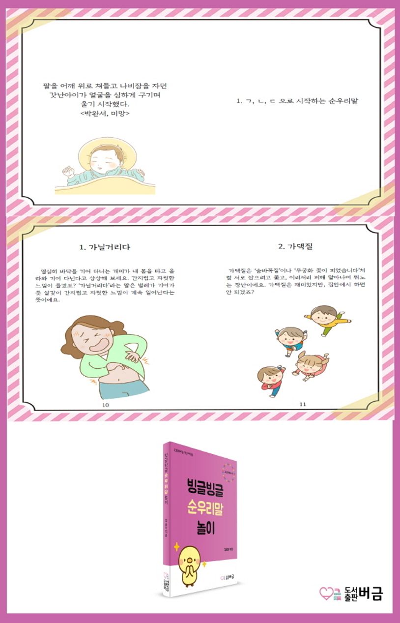《빙글빙글 순우리말 놀이》는 230개의 순우리말을 쉽고 재미있는 설명으로 구성해서, 읽다 보면 순우리말의 아름다운 매력을 느끼고 자연스럽게 순우리말 뜻을 익힐 수 있습니다.