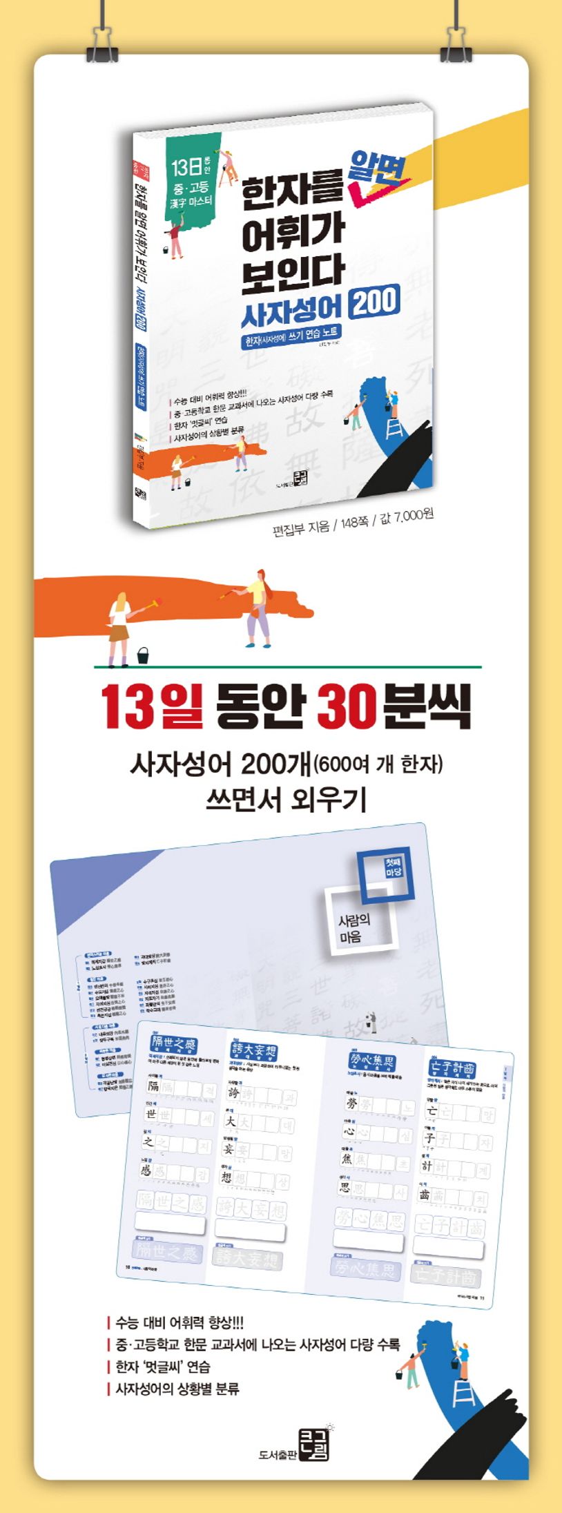 ‘한자를 알면 어휘가 보인다 - 사자성어 200’에서는 200개의 사자성어를 쓰면서 ‘한자’ 하나하나의 ‘음’과 ‘뜻’을 외울 수 있게 편집했습니다. 이 책에서 다루는 200개의 사자성어는 수능에 자주 출제되면서 중.고등학교 교과서에서도 많이 포함된 사자성어로 구성했습니다. 또 사자성어를 아무렇게나 번호로 나열하지 않고 ‘사람의 마음, 인생, 좋고 나쁘고, 많고 적고, 어리석음과 지혜로움, 말과 행동, 숫자, 속담, 위기 상황’별로 주어진 상황에 맞게 사자성어의 뜻을 분류하여 편집했습니다.