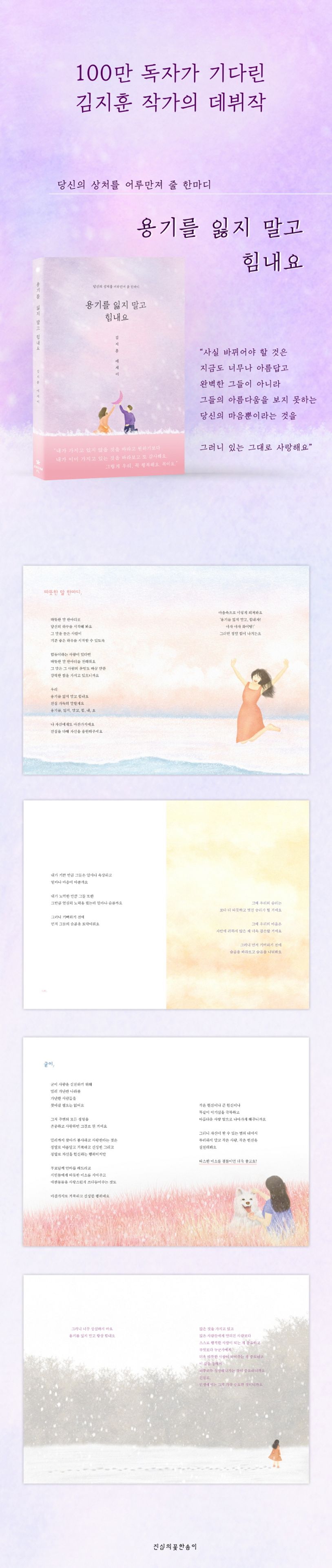 매일 100만 명이 넘는 구독자에게 힘과 용기를 주는 김지훈 작가의 데뷔작 『용기를 잃지 말고 힘내요』가 드디어 재출간이 되었다. 작가는 출간에 앞서 고민이 많았지만 작가의 출간을 설득한 것은 다름 아닌 그의 독자들이었다. 작가의 다른 책들을 읽은 독자들이 그의 책을 모두 소장하기 위해서, 그의 글들을 모두 읽기 위해서 움직이기 시작한 것이다. 오래도록 절판이 된 책을 구매하기 위해 다른 지역의 헌책방을 뒤져 책을 어렵게 구매하기도, 또 인터넷 서점에 책이 중고로라도 올라올 때까지 기다렸다가 책을 구매하기도, 그렇게 책을 어렵게 구했다며 작가에게 메시지를 보내며 오히려 감사의 인사를 전하는 독자들. 그렇게 자신의 글을 닳도록 아껴주고 또 그의 책을 소장하기 위해 고생하는 독자들의 마음에 보답하기 위해서 작가는 재출간을 결심하게 되었다고 한다. 작가가 재출간을 이토록 고민한 이유는, 자신이 이 책을 쓸 당시의 순수함을 지금은 지니고 있지 않다는 죄책감 때문이었다. 작가의 이러한 고민들은 자신이 쓴 글 앞에서 책임을 다하고 떳떳하기 위해 노력하고 있다는 그의 진실함을 반증하는 것이기도 하다.