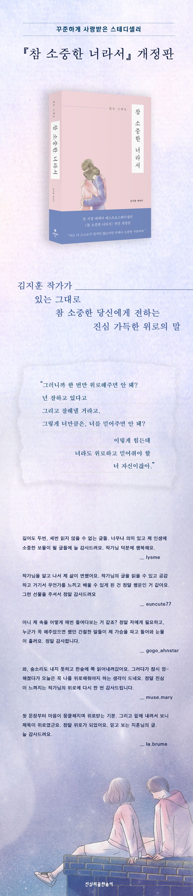 2년이 넘도록 전국 서점 베스트셀러였던, 스테디셀러 『참 소중한 너라서』의 전면 개정판이 출간이 되었다. 오래도록 수많은 독자들에게 사랑받을 수 있었던 것은 이 책에서 느낄 수 있는 김지훈 작가만의 진심 때문이 아니었을까. 작가는 이번 개정판을 통해서 처음 이 책을 냈을 당시의 부족한 점을 채우고 자신이 글에 실은 감정들을 독자들이 더욱 고스란히 느낄 수 있도록 하는 것에 가장 큰 신경을 썼다고 한다. 그때의 진심에 더해진 새로운 진심, 하여 그 따스한 무게를 가득 느끼며 위로받아보자.
