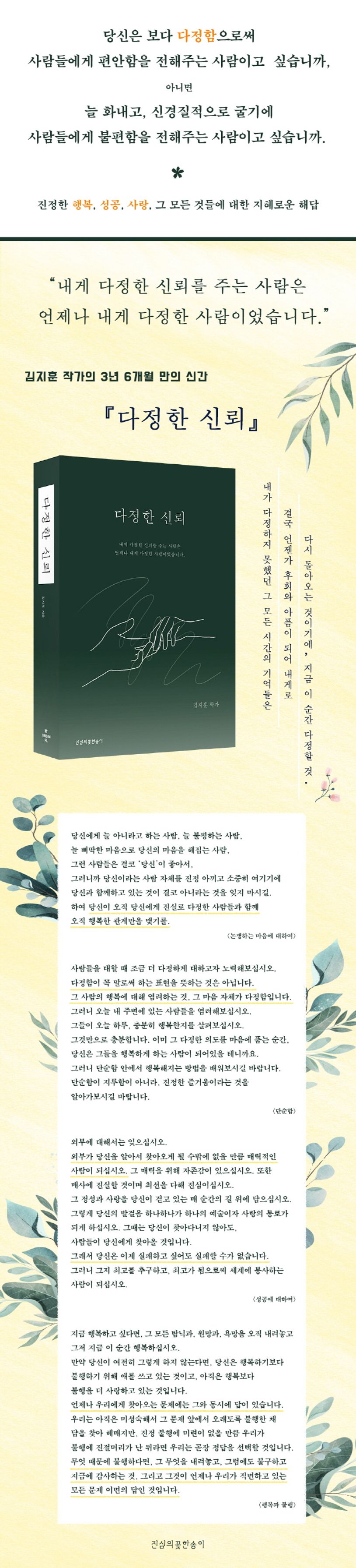 내가자주화를내고,쉽게신경질적인사람이라면사람들은나의눈치를살피게될것이고,하여무엇을하고난뒤에는조마조마한마음으로나의표정을살필것이다.하지만내가평소에다정하고온화한사람이라면,그래서늘따뜻한마음을전해준사람이라면사람들은내게서다정한반응을기대할것이고,또내게의지하고기대고자할것이다.그래서누군가가나에게화를내기보다다정한거라고기대하게되는예쁜신뢰,그것이바로‘다정한신뢰’이다.이책을읽다보면,자연스레내마음에있는다정함이더욱우세해지기시작할것이며,책을덮은뒤에는이미책을읽기전보다성숙한사람이되어있을것이다.이책은마음안에있는부정적인감정을다루지못해흔들리고있는모든이들을위해쓰여졌다.진정한행복,진정한사랑,진정한성공,그것들에대한평생에걸쳐해소하지못했던의문과비밀들이이책을통해마침내해소가되고빛날것이다.이세상모든이들이읽어봐야할책이라고감히생각하기에,당신께이책을당당하게추천하고권한다.