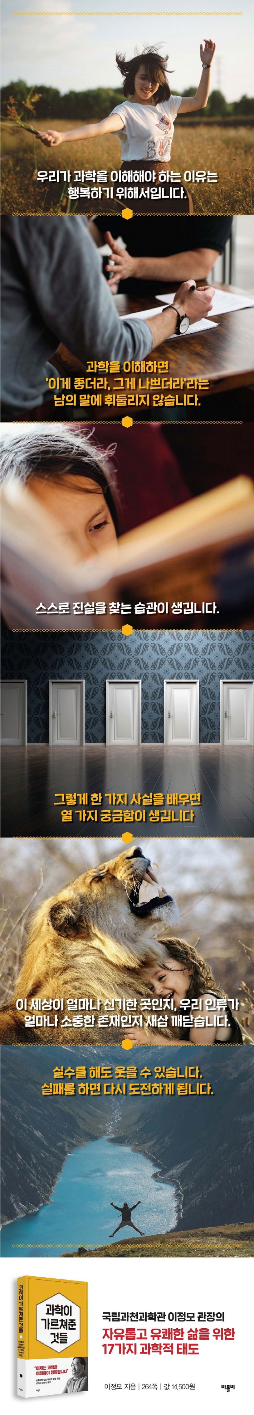 특유의 유쾌함으로 독자를 무장해제시켜온 저자의 익살은 여전하며 온갖 세상살이를 과학적 시각으로 거침없이 분석하는 호방함이 펄펄 뛰는 책이다. 더하여 검증된 과학의 경험을 통해 좋은 삶의 자세를 배울 수 있다는 것이 이 책의 매력이다. 과학을 잘 모르는 사람도 과학적 태도와 자세는 얼마든지 배우고 삶에 응용할 수 있다. 『과학이 가르쳐준 것들』과 함께라면.