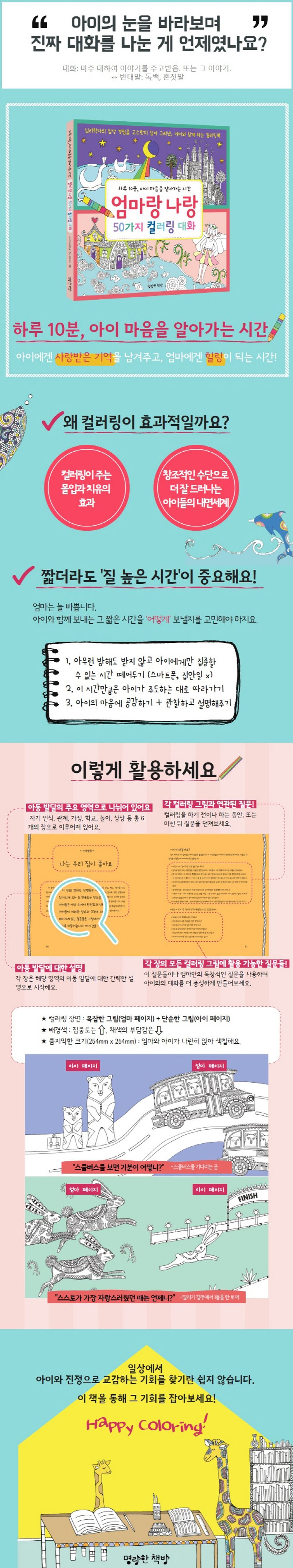 《엄마랑 나랑 50가지 컬러링 대화》는 엄마와 아이가 함께 컬러링을 하면서, 자연스럽게 다양한 대화를 나눌 수 있도록 설계된 특별한 책이다.