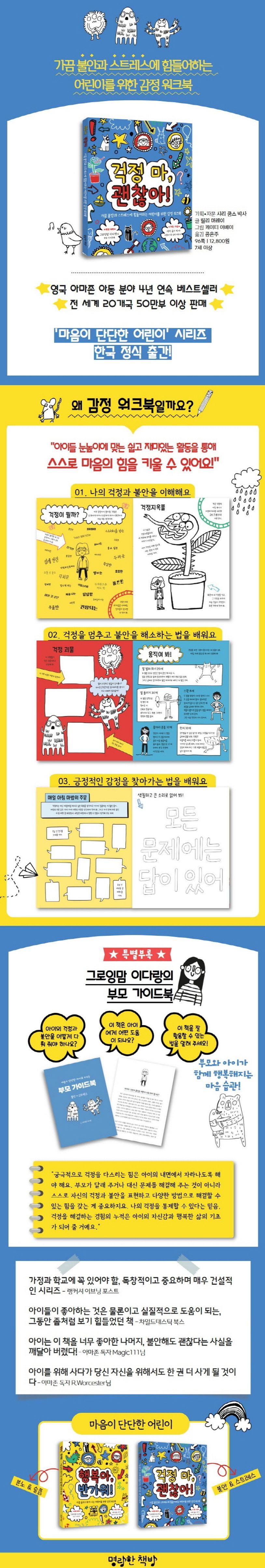 『걱정 마, 괜찮아!』는 ‘가끔 불안과 스트레스에 힘들어하는 어린이를 위한 감정 워크북’입니다. 아이들이 걱정과 불안, 스트레스를 이해하고 스스로 해결해 나갈 수 있는 힘을 길러주는 책이지요. 아이들은 대체로 자신이 걱정하는 일이 무엇인지 그 실체를 정확히 알지 못합니다. 자신이 무엇을 걱정하는지조차 알지 못하거나, 불안한 마음에 자꾸 짜증이 나는 게 사실은 걱정 때문이라는 것조차 모르는 경우도 많지요.