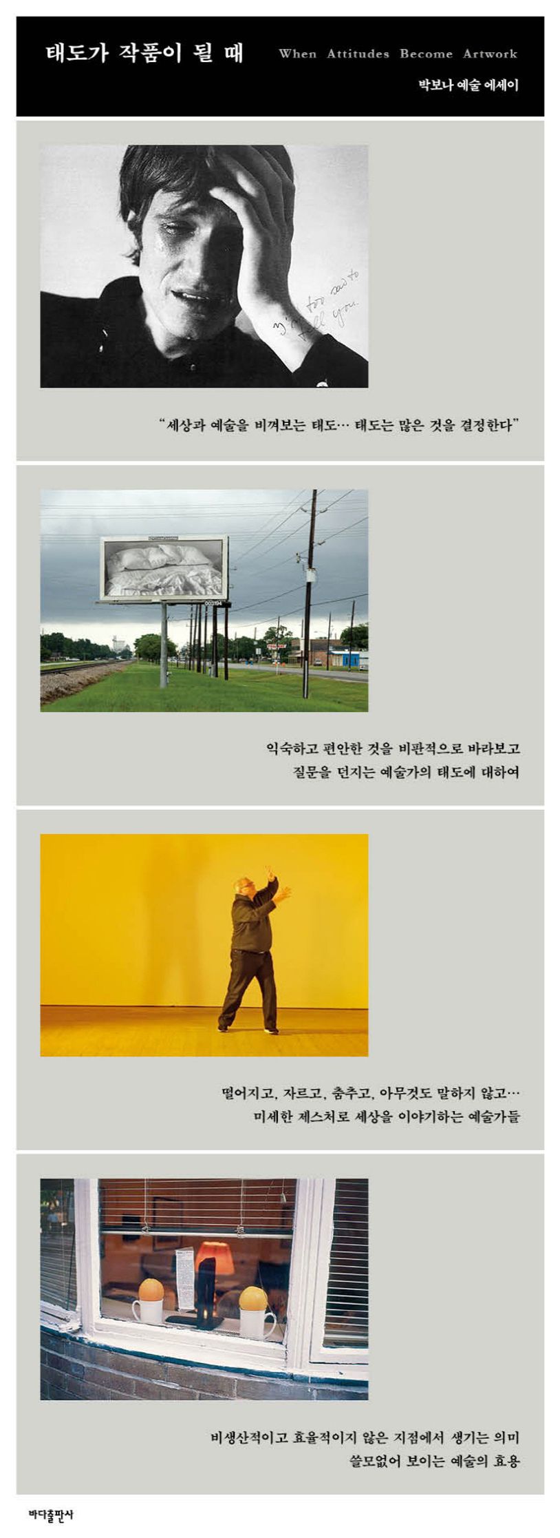 이 책의 제목 ‘태도가 작품이 될 때When Attitudes Become Artwork’는 1969년 스위스 쿤스트할레 베른에서 열렸던 전시 ‘태도가 형식이 될 때When Attitudes Become Form’에서 영감을 받았다. 이 전시는 큐레이터 하랄트 제만Harald Szeemann이 기획한 것으로 68혁명 직후에 열렸던 만큼 보수적인 기존 질서를 뒤엎고 새로운 것에 대한 열망으로 가득했다. 이 전시에서 태도는 이전 체제와 규칙에 대한 비판적 관점을 의미하며, 이 태도는 미술의 관습적인 틀을 거부하는 새로운 작품의 형식과 전시의 형태로 구현되었다. 박보나는 이 책에서 소개하는 작가들 또한 하랄트 제만이 기획한 전시 ‘태도가 형식이 될 때’의 정신을 이어받는다고 말한다.