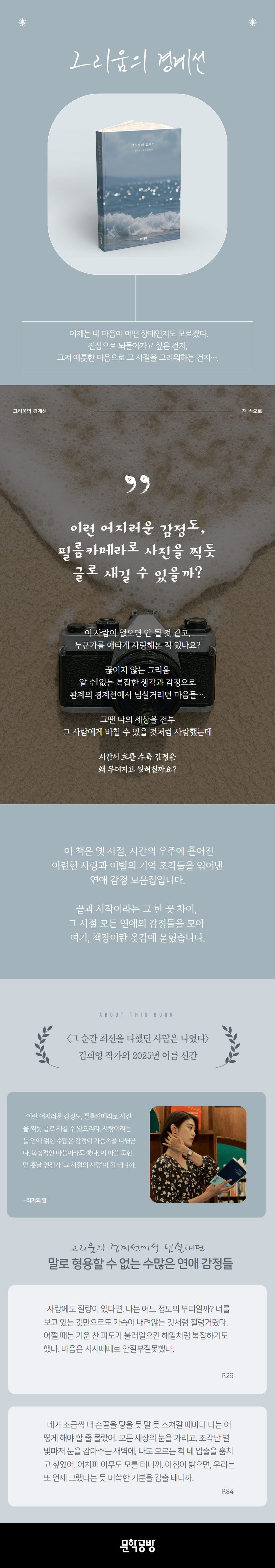 책 《그리움의 경계선》은 사랑하고, 이별하고, 그리워했던한 사람의 마음이 지나온 풍경들을 꾹꾹 눌러 담은 “연애감정집”입니다.