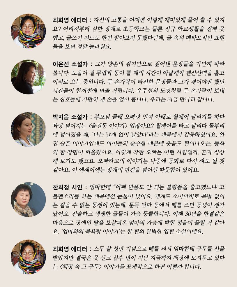 지난 10년의 습작기를 거치며 그녀가 써온 수많은 작품들 가운데 12편을 골라 첫 에세이집을 펴냈다. 표제작 「책장 속 그 구두」는 스무 살이 된 기념으로 하이힐이 한번 신고 싶었던 여성 장애인의 진솔한 자기 고백으로 ‘휠체어 성장통’을 그린 대표작이다.