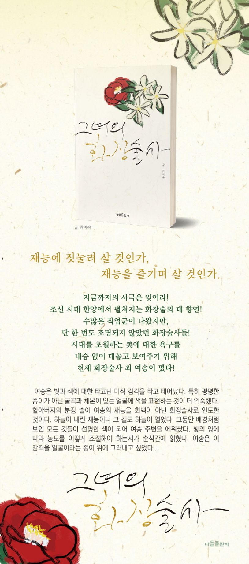 조선을대표하는미녀호영공주.조선을삼키려는야욕을품은가상의나라인대금나라의최고실력자장원평.대금나라공주이자조선의후궁이된,코브라처럼독한파괴본능후궁탕유청.어느날이들이미천한화장술사인최여송에게모든신경을곤두세운다.도대체,무엇때문에최여송은조선왕실의중심인물이될수밖에없었을까?화장속에숨겨진왕실의비밀과그속에서싹튼은밀한사랑이〈그녀의화장술사〉에서펼쳐질것이다.