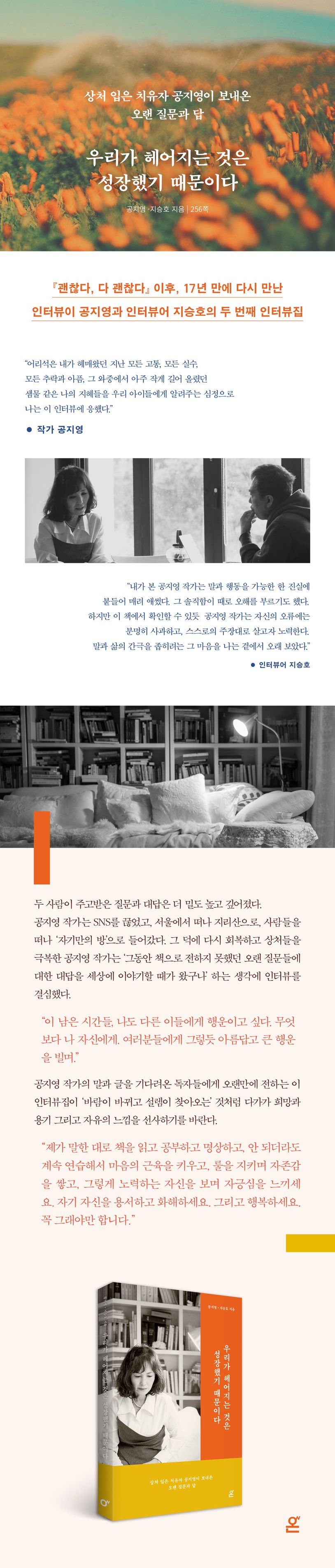오래간만에, 17년 만의 공지영 작가의 인터뷰집이다. 이번에도 독자들을 대신해 지승호 인터뷰어가 공지영 작가를 만났다. SNS를 끊고, 서울에서 떠나 지리산으로, 사람들을 떠나 ‘자기만의 방’으로 들어간 공지영 작가가 보내온 오랜 질문에 대한 답이다. 결코 짧지 않은 시간이 흐른 만큼 두 사람이 주고받은 질문과 대답은 더 밀도 높고 깊어졌다.