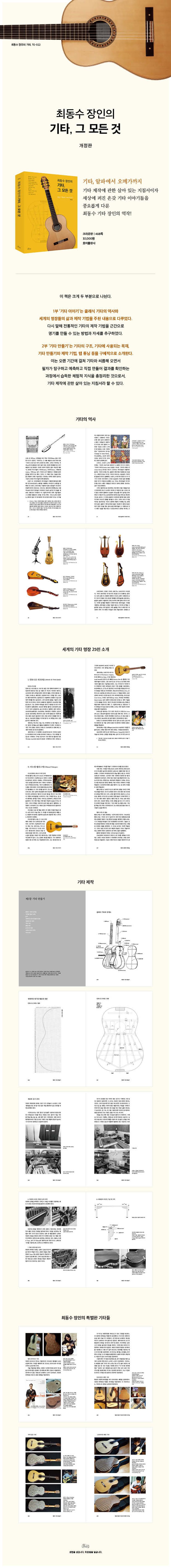 「기타, 그 모든 것」의 지은이 최동수 장인이 지금 일흔여덟 나이에 변함없이 벼리고 있는 꿈이다. 그는, 그런 한편, 지난날 운이 좋아 자신의 능력보다 후한 대우를 받았다고 여겨, 사회가 그에게 준 것을 다시 사회에 되돌리고 싶다는 뜻을 지녀왔다. 그리하여, 기타를 직접 만들면서 얻은 지식과 경험을 인터넷에 올려 일찍부터 기타 마니아들과 정보를 나누어왔거니와, 지난 몇 십 년 동안 책을 통해, 해외의 기타 공방과 장인과의 만남을 통해, 직접 기타를 만들어온 체험을 통해 쌓아온 ‘기타에 관한 모든 것’을 한 권의 책에 담아 세상에 내놓게 된 것이다.