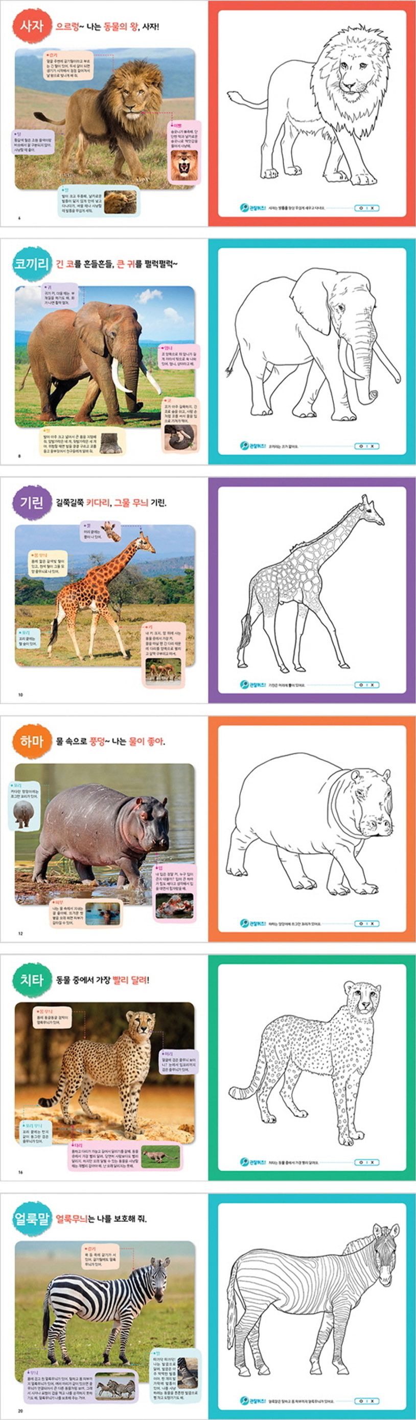 생생한 동물 사진을 관찰하면서 동물의 색을 똑같이 색칠할 수 있고, 창의력을 발휘하며 다른 색으로 색칠할 수도 있습니다.