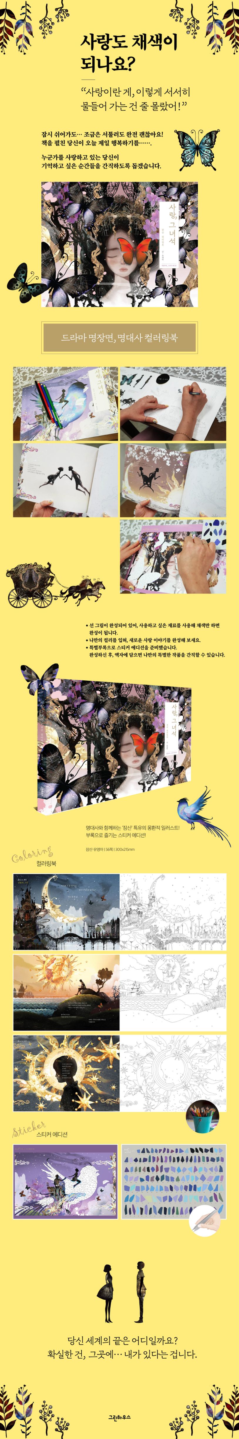 어쩌다 마주친 만남이 결국은 만날 수밖에 없는 운명이라는 이야기로 드라마는 엔딩이 되었지만, 극 중 남자 주인공과 여자 주인공의 명대사와 함께 만난 컬러링북은 조금 색다른 모습이다. 대사를 음미하며 채색을 입히고, 노련한 손동작이 필요한 스티커로 조각 퍼즐을 완성해가는 특별한 에디션. 하루게 멀게 문명이 진화하듯 사랑도 진화된다. 굳이 진화까지는 아니더라도 사랑은 매 순간 다른 컬러를 입는다. 소설을 읽듯, 이야기를 즐기면서 오늘의 마음을 컬러로 표현해 보자. 사랑으로 인한 마법 같은 행복이 지금 책과 마주한 여러분에게도 가득하길 바란다.