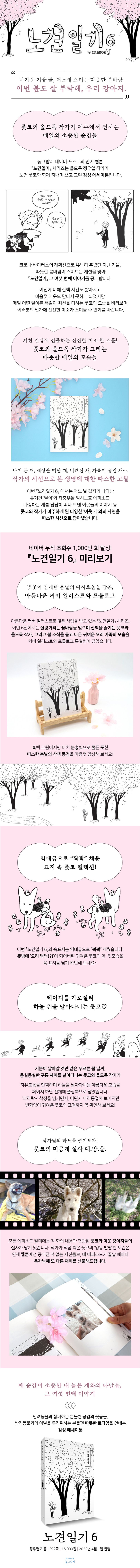코로나 바이러스의 재확산으로 유난히 추웠던 지난 겨울. 따뜻한 봄바람이 스며드는 계절을 맞아 『노견일기』 그 여섯 번째 이야기를 공개한다. 이전에 비해 산책 시간도 짧아지고 마음껏 이웃도 만나지 못하게 되었지만 매일 어떤 일이든 똑같이 최선을 다하는 풋코의 모습을 바라보며, 독자들의 입가에 잔잔한 미소가 스며들 수 있기를 바란다.
