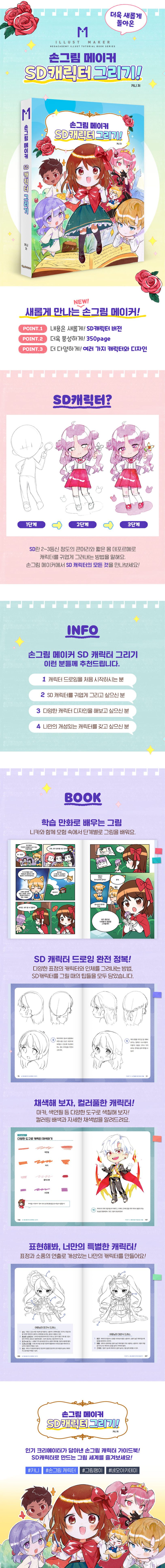 PART.1용사등장!표정없는마을Chapter.1데포르메알아보기Chapter.2반짝반짝!눈동자그리는방법Chapter.3코그리기Chapter.4입그리기Chapter.5다양한손모양그리기Chapter.6귀그리기Chapter.7캐릭터의표정을그려보자!그림그리기캐릭터를그려보자!직접캐릭터의이목구비를그려보자!PART.2스타일링!머리없는마을Chapter.1캐릭터의머리카락을그려보자Chapter.2정면캐릭터의머리카락그리기Chapter.3옆모습의머리카락그리기Chapter.4다양한머리카락그리기Chapter.5다양한헤어스타일그리기그림그리기직접머리카락을그려보자!PART.3드레스업!디자인연습하기Chapter.1다양한포즈와옷주름을알아보자Chapter.2다양한의상디자인하기Chapter.3캐릭터그려보기그림그리기캐릭터를따라그려보자!PART.4페인트업!색깔없는마을Chapter.1다양한도구로캐릭터채색하기Chapter.2목각인형의식빵마법사의상Chapter.3목각인형의코코아마녀의상Chapter.4목각인형의불의마법사의상Chapter.5목각인형의꽃의마녀의상그림그리기직접채색을해보자!PART.5디자인업!디자인시작하기Chapter.1다양한의상과소품그리기Chapter.2장신구그리기Chapter.3의상디자인하기그림그리기프릴을따라그려보자!의상을따라그려보자!PART.6용사퇴장!디자인완성하기Chapter.1배색알아보기Chapter.2다양한소품으로의상꾸미기Chapter.3의상채색하기Chapter.4여왕님의드레스채색하기그림그리기연미복을따라채색해보자!나만의연미복을만들어보자!드레스를따라채색해보자!나만의드레스를만들어보자!
