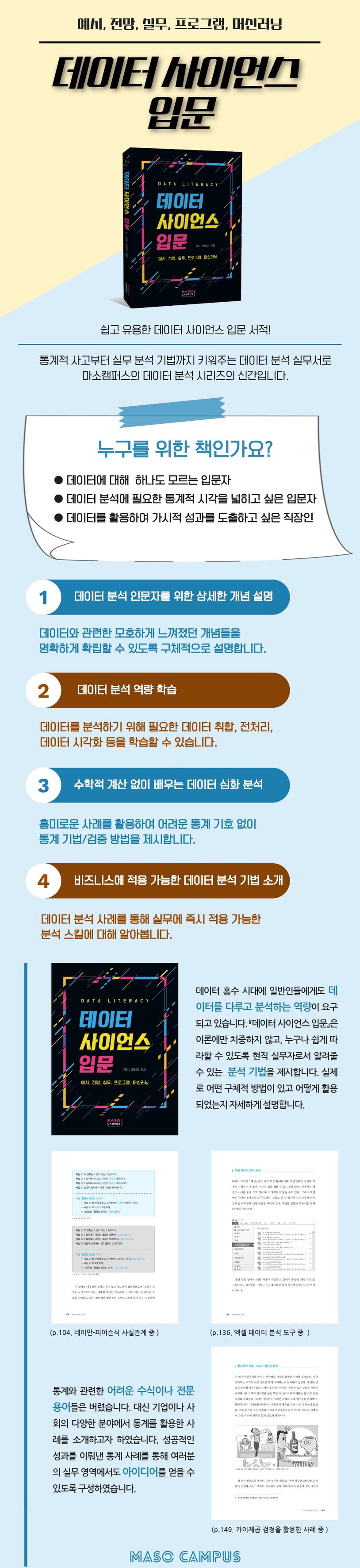 데이터 분석, 이제는 4차 산업 혁명 시대에 꼭 필요한 핵심 역량. 데이터 분석 전문가들에게만 국한되는 이야기가 아니다. 인문, 과학, 예술 등 업종불문 데이터를 분석해야만 의미 있는 성과를 거둘 수 있는 시대이다. 그리고 이러한 추세는 앞으로 지속될 전망이다. 이에 기업은 데이터 분석을 통해 도출된 솔루션으로 다양한 형태의 데이터 인사이트를 실시간으로 발굴하고 복잡한 의사결정을 자동으로 해결함으로써 지속적인 수익창출을 위해 노력하고 있다. 사업의 목표가 곧 이윤창출이라면 데이터 분석이 해답이다. 여러분이 어느 기업에 있든지, 기업의 매출 상승을 위해서 데이터 분석을 반드시 활용해야 한다.