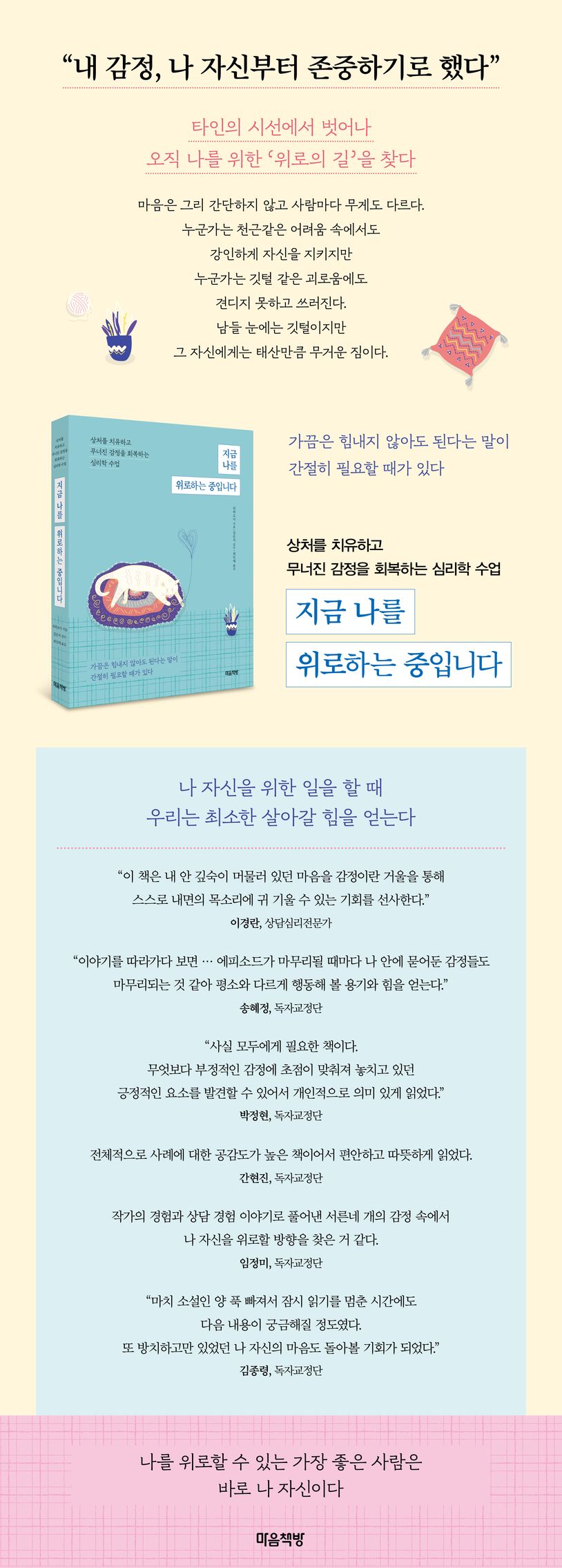 사람은 저마다의 사정이 있고 저마다의 아픔이 있다. 남 보기에 별문제 없는 가정에서 큰 굴곡 없이 자란 사람도 마음의 병을 앓는다. 이렇듯 누구나 타인은 결코 이해하지 못하는 자신만의 상처가 있다. 마음의 상처는 신체적 상처와 달리 겉으로 잘 드러나지 않아서 치유와 회복이 쉽지 않다. 이 책 《지금 나를 위로하는 중입니다》는 누구나 하나쯤 갖고 있는 자신만의 상처와 부정적인 감정으로 삶이 뒤흔들리고 자존감이 무너진 이들에게 스스로 치유하고 극복할 수 있는 이야기를 들려준다. 저자 자신의 경험과 실제 상담 현장에서 보고 들은 생생한 사례를 통해, 마치 인생을 조금 더 살아본 큰언니, 큰누나처럼 조곤조곤 들려준다. 독자교정단 김종령 님은 “마치 소설인 양 푹 빠져서 잠시 읽기를 멈춘 시간에도 다음 내용이 궁금해질 정도였다. 또 방치하고만 있었던 나 자신의 마음도 돌아볼 기회가 되었다”라고 소감을 밝혔다.