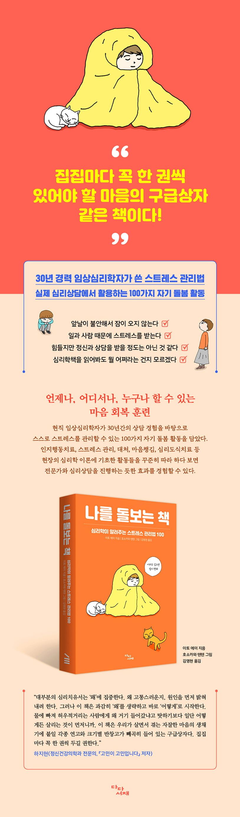 “혹시 제가 우울증은 아닐까요?”, “힘들지만 정신과 상담 받기는 좀 꺼려져요.”, “괴로울 땐 심리학책을 사서 읽어요.” 등 많은 사람들이 스트레스 때문에 괴로워하며 살아가지만, 어떡해야 회복될지 구체적인 방법은 알지 못한다. 잠깐의 ‘힐링’을 주는 취미를 찾고 심리치유서를 읽으며 기분 전환을 해봐도 좀처럼 근본적인 회복과 변화는 일어나지 않는다. 『나를 돌보는 책』은 스트레스에 휘둘리며 괴로워하는 많은 이들에게 스스로 스트레스를 ‘관리’하는 법을 알려주기 위해 출간되었다. 현직 임상심리학자인 저자는 30년간의 심리상담 경험과 심리학 지식을 총동원해 스트레스로 병든 마음을 회복시키는 구체적인 방법을 전해준다.