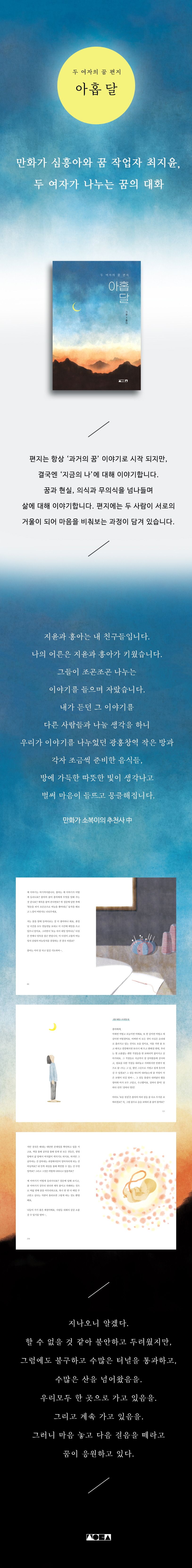 우리는 매일 밤 꿈을 꾼다. 대부분은 그 꿈을 대수롭지 않게 여기거나, 혹은 잘못된 편견으로 길몽, 흉몽을 구분 지어 의미를 부여하는 실수를 한다. 하지만, 꿈은 마음이 그려내는 신비로운 그림이자 무의식이 들려주는 진솔한 이야기이다. 〈아홉 달〉은 두 저자가 주고 받는 편지를 통해, 꿈의 이야기에 귀 기울이며 삶의 균형을 찾아가는 과정을 고스란히 담고 있다.