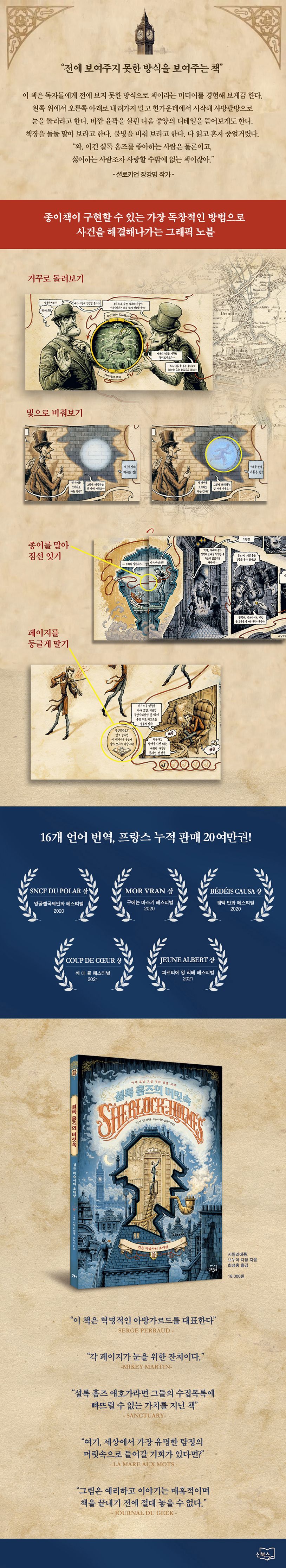 『셜록 홈즈의 머릿속』은 프랑스의 두 삽화가가 그들의 영웅이었던 탐정 셜록 홈즈의 사건조사 과정을 그래픽 노블로 각색한 작품이다. 이 재능 있는 프랑스 삽화가들은 소설의 오리지널리티를 계승하면서도, 접근방법을 달리해 다락방으로 상징되는 홈즈의 두뇌로 잠입하는 방법을 설정했다. 이에 기존의 셜록 홈즈 시리즈를 영화·드라마화 한 타 작품들과는 확연이 구별되는 개성을 드러내는데, 독자들은 이 책을 읽는 내내 홈즈의 추론 과정을 탐색하는 한편, 정교하게 계산된 트롱프뢰유(trompe-l'oeil)를 제공받는다.