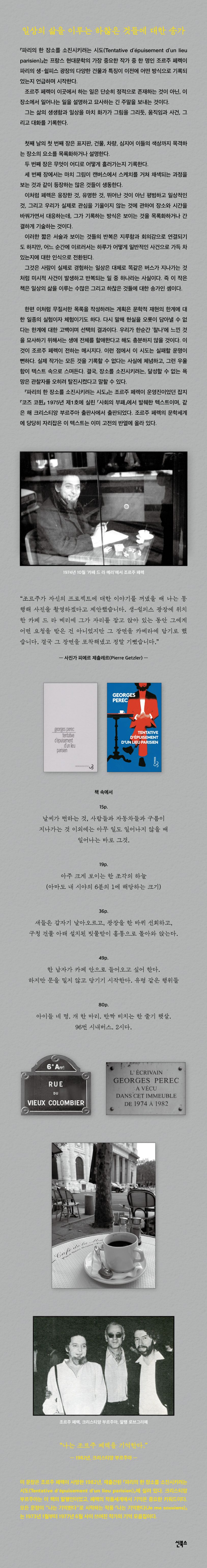 1974년 10월의 어느 흐린 주말, 조르주 페렉은 지극히 평범하며 일상적인, 즉, ‘아무 일도 일어나지 않을 때, 일어나는 일’에 대하여 탐구했다.