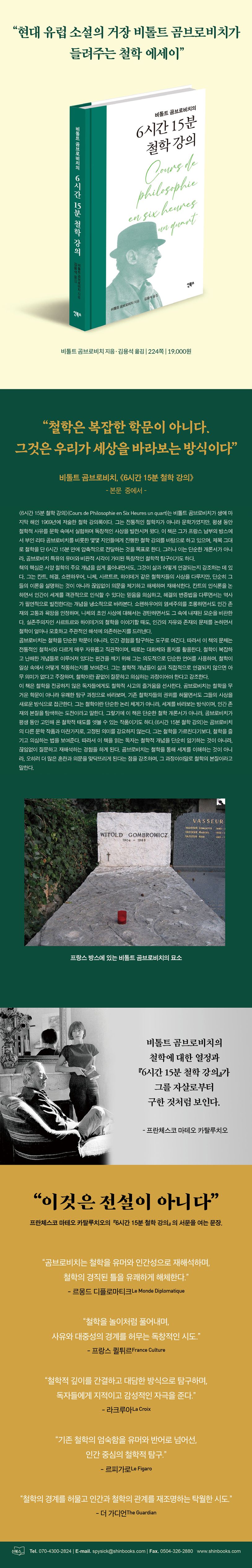비톨트 곰브로비치의 『6시간 15분 철학 강의』는 그의 말년 철학 강의 노트를 바탕으로 한 독특한 철학 에세이다. 이 책은 1969년 곰브로비치가 프랑스에서 건강이 악화된 상태에서 아내 리타와 친구 도미니크 드 루를 위해 진행한 철학 강의를 기록한 것으로, 그가 사망하기 직전에 작성되었다.