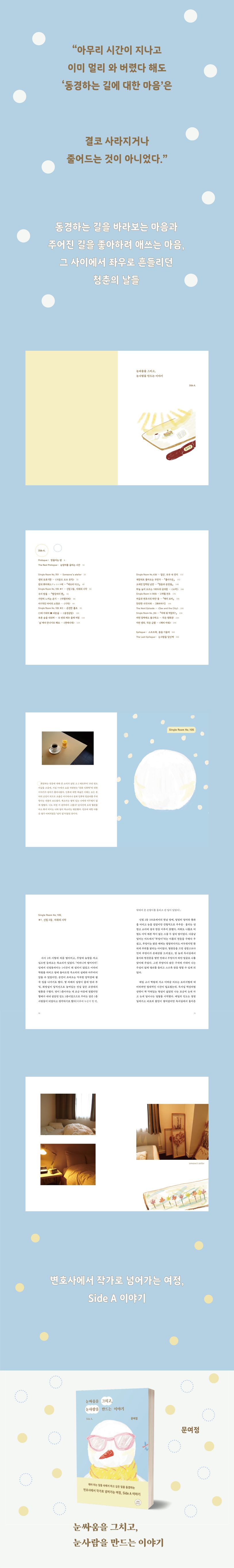 2020년부터 “좋아하는 글을 쓰고 싶어서, 변호사를 그만두고 작가가 되었어요”라는 말을 하고 다니는 동안 전염병의 시기는 끝없이 이어지고, ‘나’는 30대 중반에 다시 고시생 모드로 접어들었음을 깨달았다. 그러자 자연스레 신림동 고시생 시절을 버티게 해 주었던 긴 이름들이 생각났다. 책과 영화, 드라마의 제목들이. 그 이야기들에 기대어, 결코 사라지거나 줄어들지 않던 ‘좋아하는 마음’을 가만히 되짚으면서, 수없이 서성이던 날들과 기존 경로에서 스르르륵 벗어나는 순간의 이야기를 ‘A면’(Side A)에 담았다. 이제 ‘눈싸움을 멈추고 눈사람을 만들게 된 이야기’를 시작해 보려 한다.