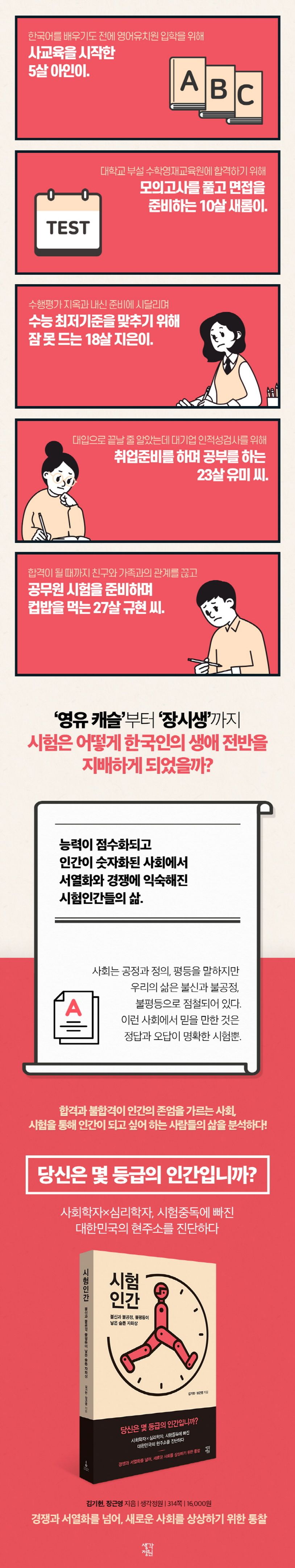 선발과 경쟁을 가르는 시험이 왜 문제가 되는 것일까? 시험에 따른 사회적 보상이야말로 다툼의 여지없는 가장 공정한 방식이 아닌가! 이 책은 시험을 당연하게 여기고, 그에 따른 결과에 철저히 복종하는 시험인간의 맨얼굴을 드러낸다. 《시험인간》의 저자들은 이대로 시험인간들의 세상이 계속될 경우, 승자독식으로 인한 갑질과 불평등 문제, 시험만이 공정하다는 맹신 속에서 사회 제도를 비판적으로 볼 수 없다는 측면을 책 속에서 선명하게 드러낸다. 이들의 결론은 오랫동안 추적해온 연구결과와 그 과정에서 만난 사람들과의 인터뷰를 통해 독자들에게 더 입체적으로 다가갈 것이다.
