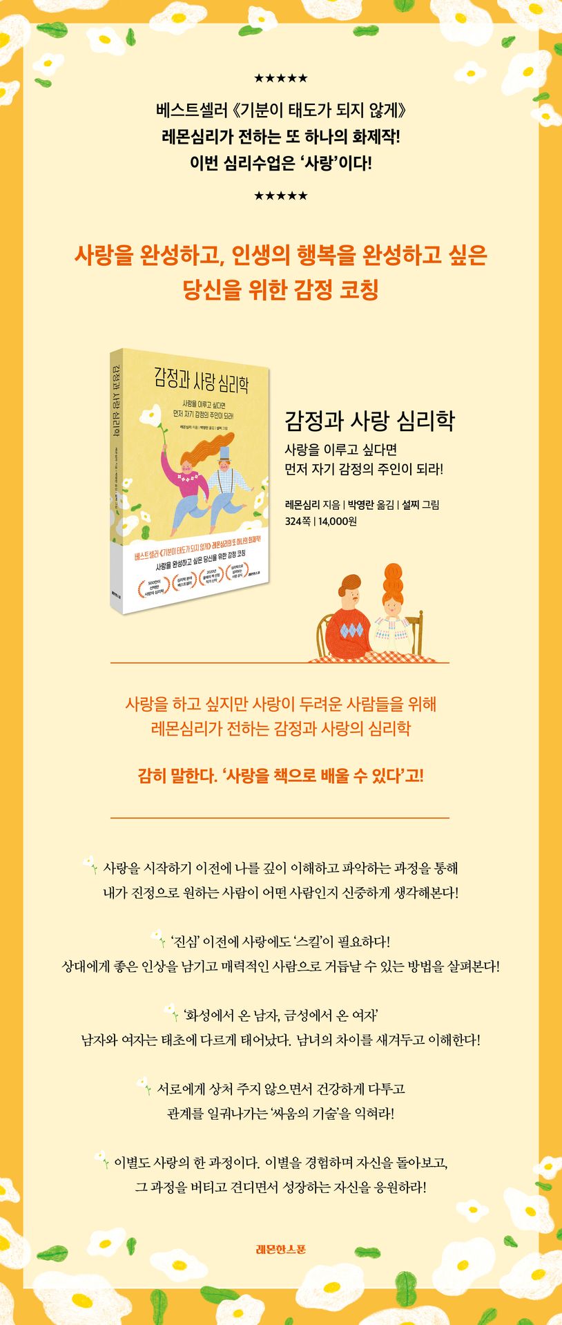 《감정과 사랑 심리학》에는 누구나 한 번은 겪어봤을 사랑과 이별에 관한 생생한 이야기들이 담겨 있다. 그 이야기와 함께 울고 웃으며, 그리고 사랑과 당신의 감정에 관한 레몬심리의 조언을 들으며 당신은 사랑에 대해 충분히 생각하고 깨달음을 얻게 될 것이다.