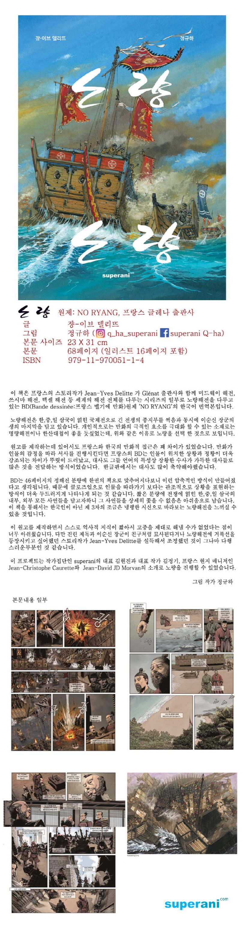 인류문명의 흐름에서 해군의 영향력은 항상 막강했다. 단순한 군대의 개념에서 나아가 과학기술의 핵심을 보유한 곳이었다. 근대이전, 굵직굵직한 전쟁에서 승패는 해군에게 주로 달렸다. 트라팔가, 윌란반도, 레광트전투는 이를 증명한다. 쟝-이브 델리뜨는 새로운 '컬렉션 시리즈'를 통해 역사 속 치열했던 해양전투 중심부로 독자들을 초대한다. 노량. 16세기 일본은 강력한 국가를 만들기 위해 야심차지만 교만한 계획을 세운다. 중국의 황제의 영향에서 벗어나고 패권을 차지하기 위한 책략을 꾸민다. 이는 이웃 조선과의 전쟁을 의미했고 야욕의 깃발은 거침없었다. 1592년 5월 25일. 일본의 20만 군대가 조선 남쪽 연안가에 상륙했다. 장장 7년에 걸친 임진왜란이 시작된 것이다. 조선 강토의 전선은 비참했고 노량은 치열했다. 노량은 역사의 변곡점에 우뚝서서 당당하게 헤쳐나간 조선해군의 드라마다. 승리의 영광과 전투의 슬픔은 고스란히 노량바다의 물결속에 담겨있다. 그 중심에 조선의 승부사가 있다. 이순신이다. 노량해전은 그와 그의 병사들 이야기다.