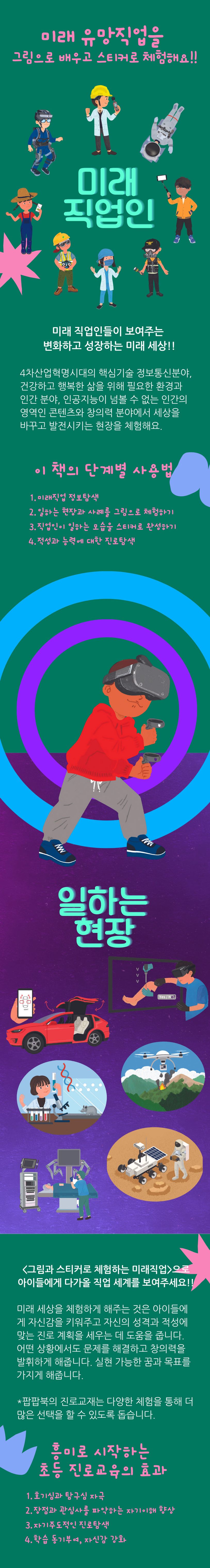 미래세상을 움직여갈 직업인들이 일하는 모습은 아이들에게 미래를 예측하고 대비하는 데 도움이 될 것입니다. 빠르게 변화하는 세상 속에서도 내가 하고 싶은 일을 창의적으로 해내는 능력을 키워줄 것입니다.