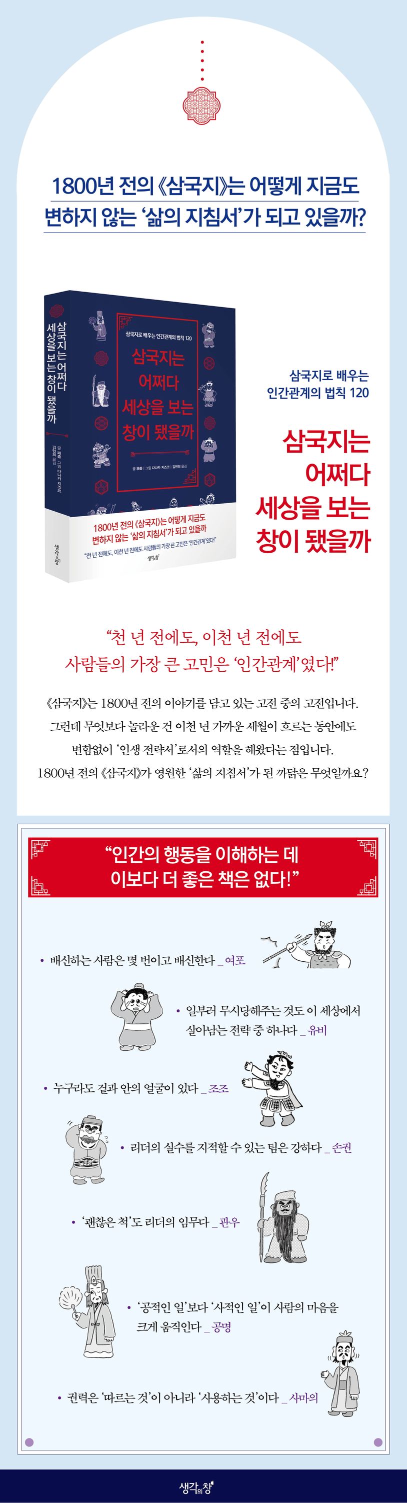 《삼국지》를 펼치면 누구나 먼저 그 방대한 양에 놀란다. 그리고 수많은 사람들의 이름과 지명에 혼란을 느낀다. 이런 이유로 삼국지 전편을 읽는 것을 부담스러워하는 사람들이 많다. ‘그렇다면 1800년 전의 사람이나 현대이나 똑같이 고민하고 있는 인간관계에 초점을 맞춰 삼국지를 접해보는 것은 어떨까?’ 이 책은 이런 고민에서 시작됐다. 그래서 이 책의 원제가 ‘삼국지로 배우는 인간관계의 법칙 120’이기도 하다.