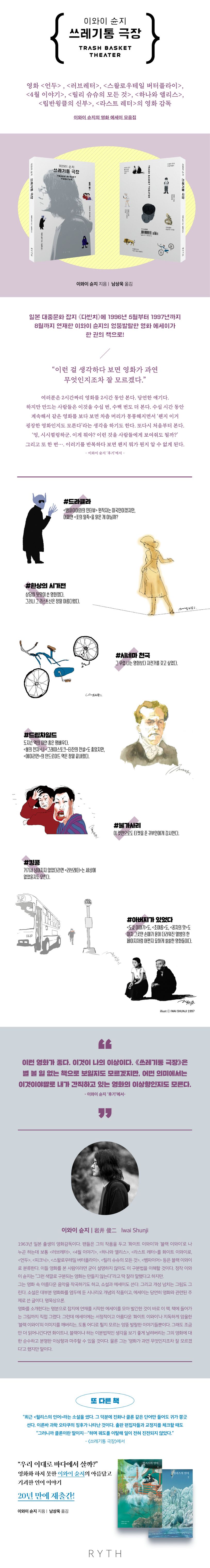 일본 대중문화 잡지 〈다빈치〉에 1996년 5월부터 1997년까지 8월까지 연재한 이와이 슌지의 엉뚱 발랄한 영화 에세이가 한 권의 책으로 나왔다. 이와이 슌지는 여전히 어떤 제목이었는지도 모르는, 잘못 시청한 영화까지 마음에 담고 살아가는 괴짜 영화광. 텔레비전에서 방영하는 괴수 영화를 챙겨 보던 그의 어린 시절과, 주머니 탈탈 털어서 마지막 남은 지폐 한 장까지 필름으로 맞바꿔 영화를 만들던 대학 시절, 그리고 영화 〈러브레터〉, 〈피크닉〉, 〈스왈로우테일 버터플라이〉 등을 만들던 영화감독 시절의 이야기까지 ‘약방에 감초’처럼 이 책에 담겨 있다. 그의 팬이라면 더없이 반가운 작품!