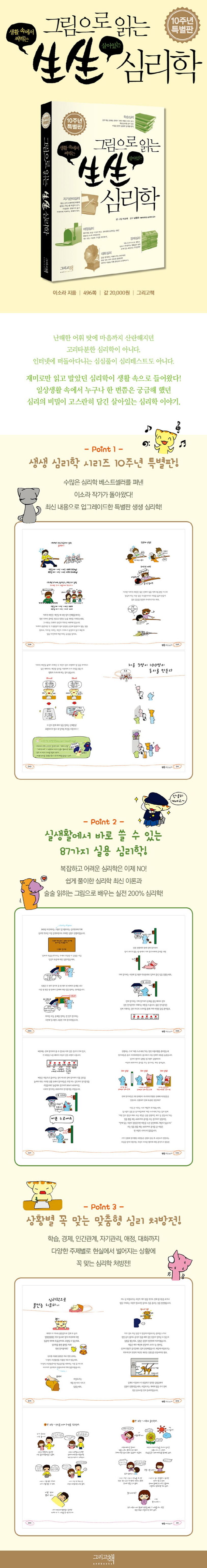 〈그림으로 읽는 생생 심리학〉, 〈부모들이 읽는 아이들 생생 심리학〉, 〈그림으로 읽는 생생 연애 심리학〉 등 수많은 심리학 베스트셀러를 펴낸 이소라 작가가 돌아왔다! 이번 특별판은 기존의 심리학 시리즈에서 독자들의 가장 많은 사랑을 받았던 에피소드를 한데 묶고 최신에 맞는 내용을 담았다. 난해한 심리학 용어도 그림과 글로 쉽게 풀이하는 작가만의 매력으로 재미있는 심리학 세계에 빠져보자.